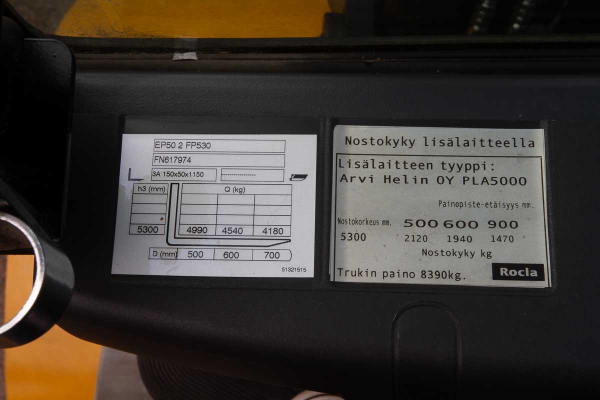 Sähkökäyttöinen vastapainotrukki 5000 kg:n nostokapasiteetilla. Kolmijatkeinen vapaanostomasto, nostokorkeus 5300 mm. Arvi Helin -asetinlaite.