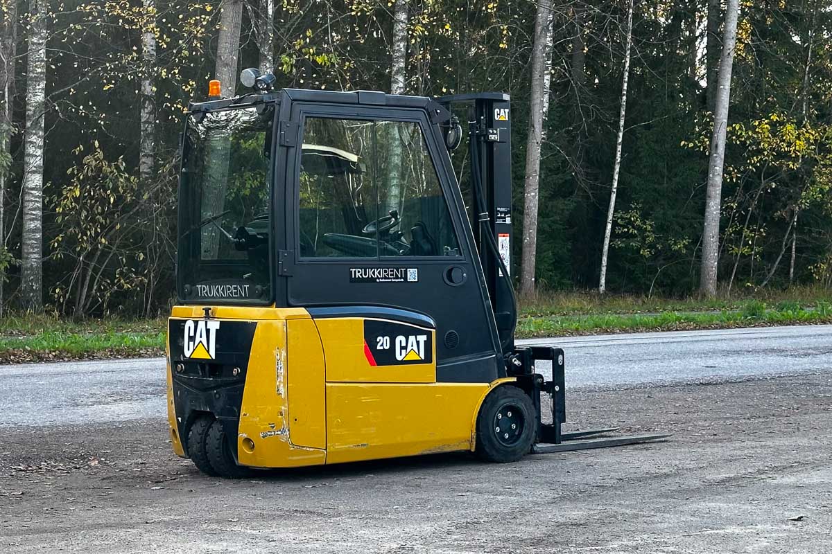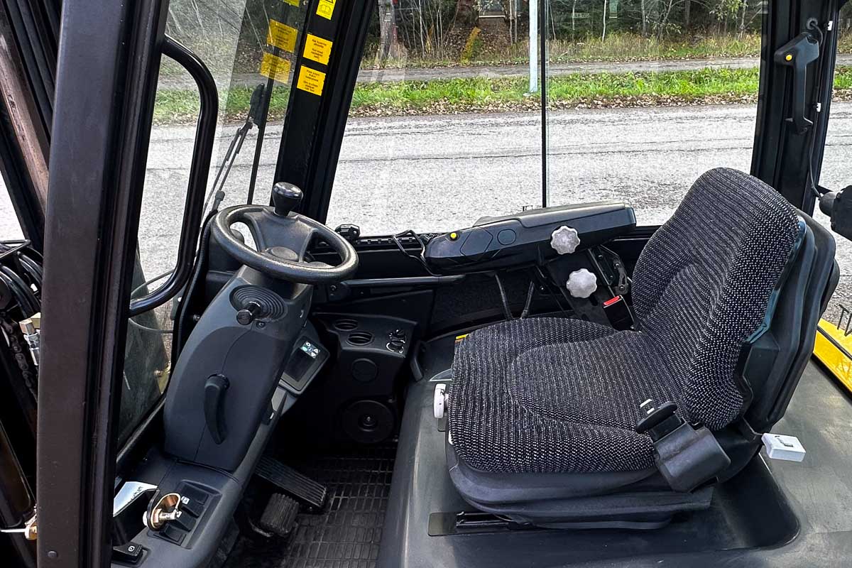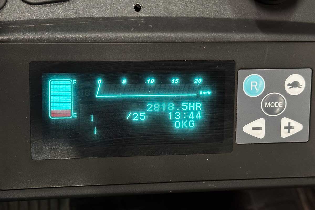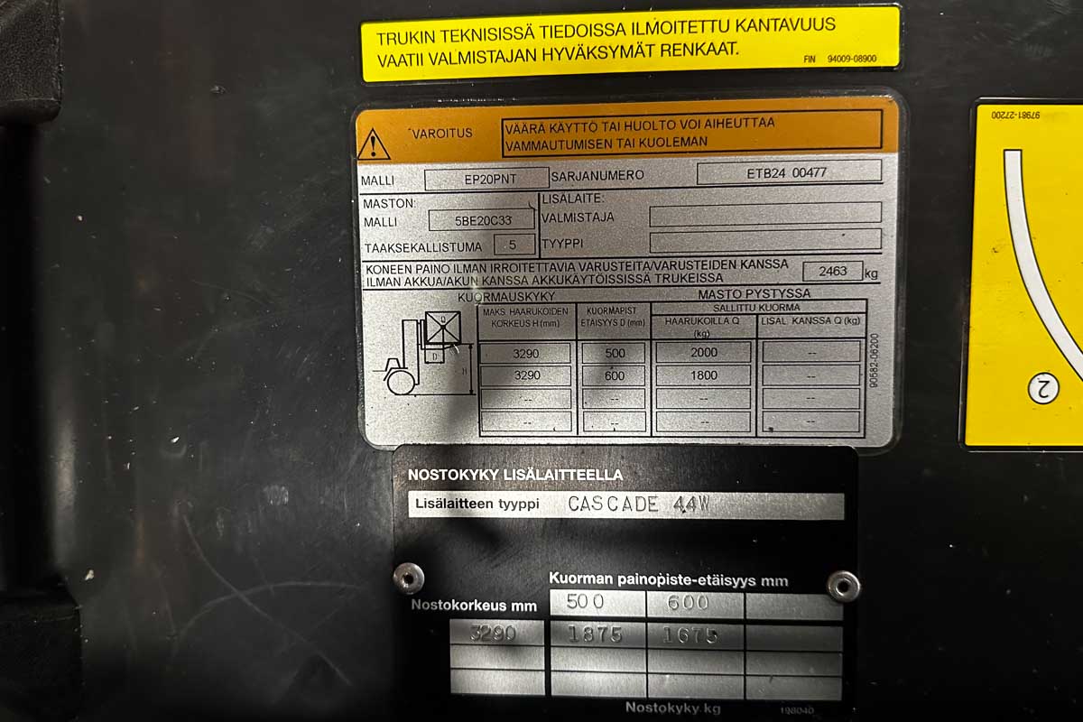 Umpihytillinen sähkövastapainotrukki 2000 kg:n nostokyvyllä. Kaksijatkeinen masto, suurin nostokorkeus 3290 mm. Tuore akku (2024).