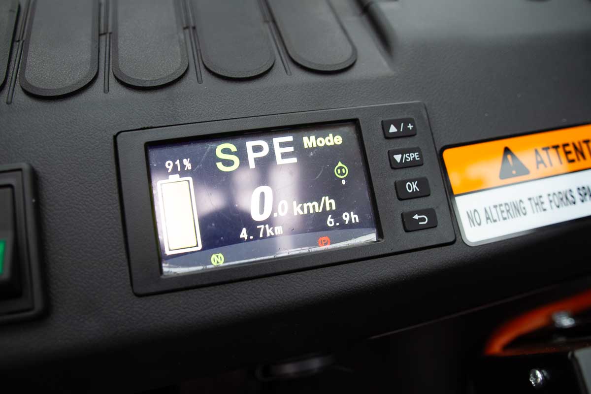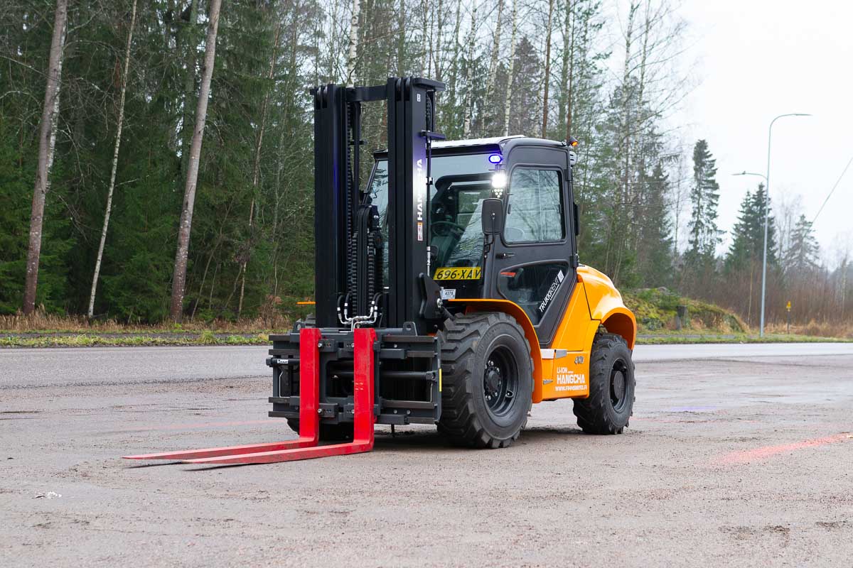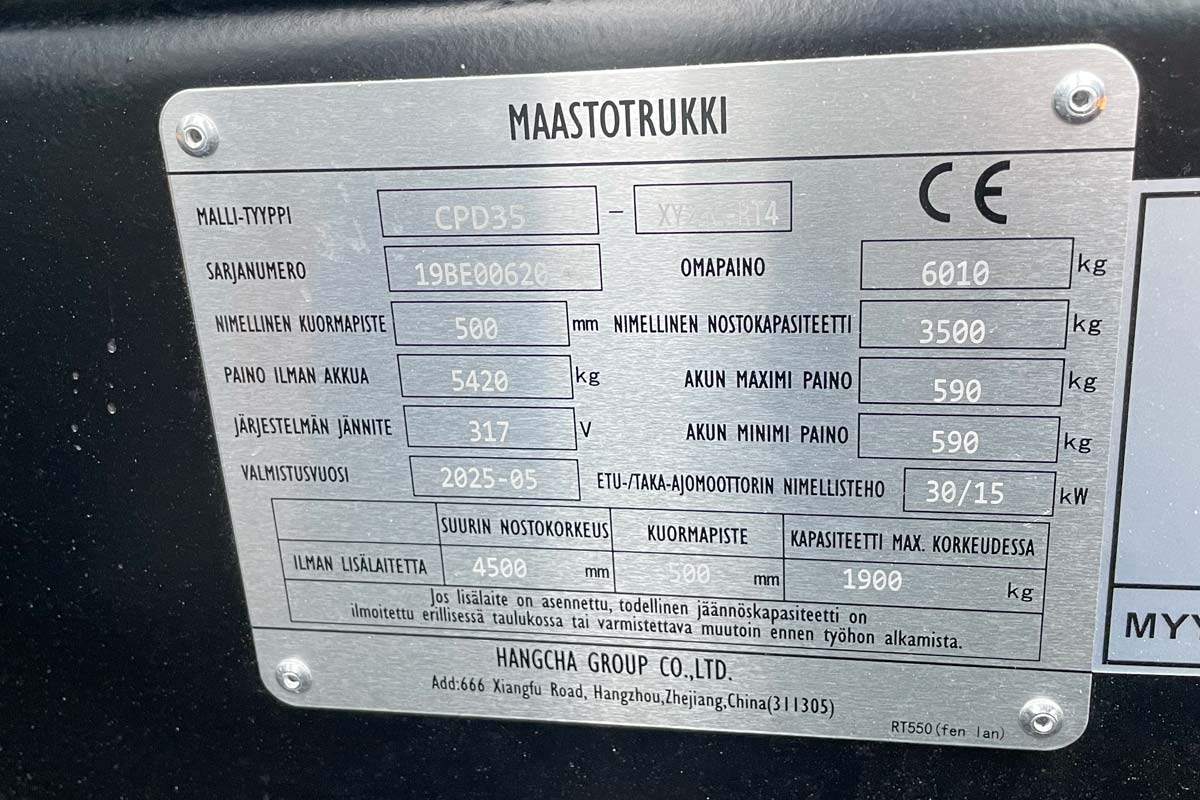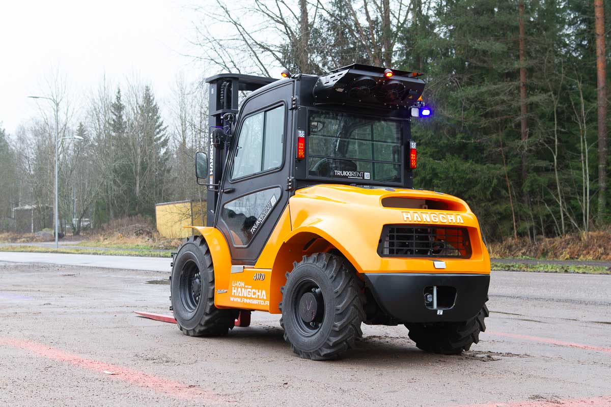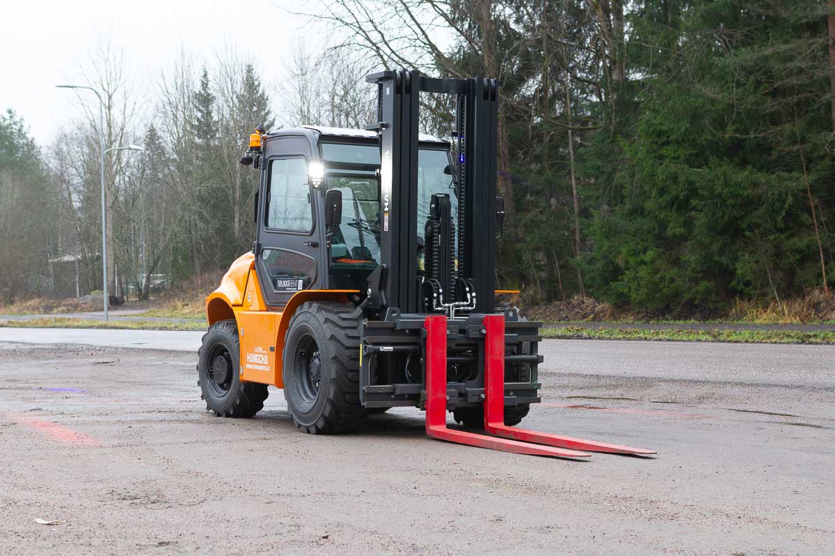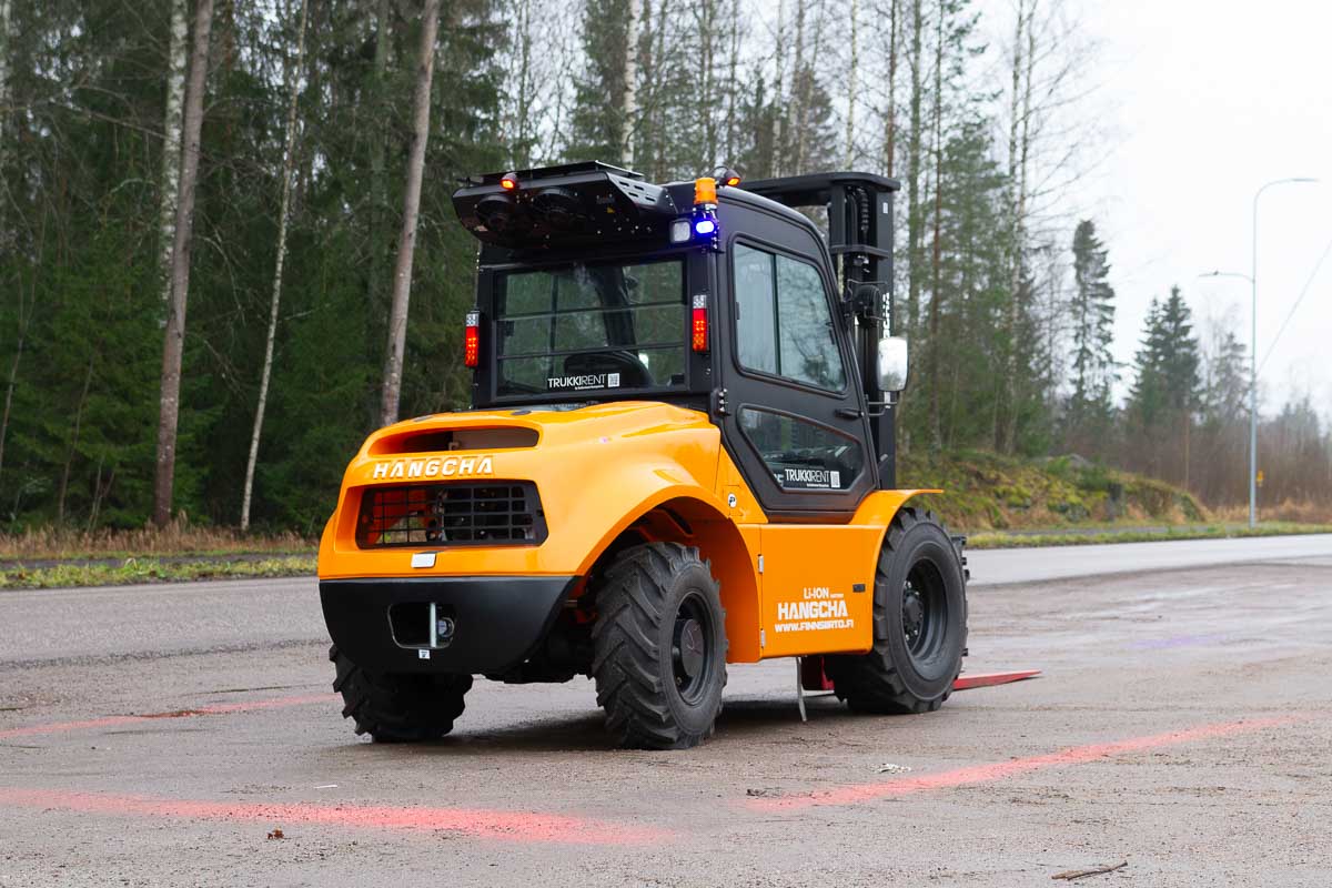 Modernilla korkeajännitetekniikalla varustettu sähkökäyttöinen maastotrukki. Neliveto, nostokyky 3500 kg, nostokorkeus 4500 mm.