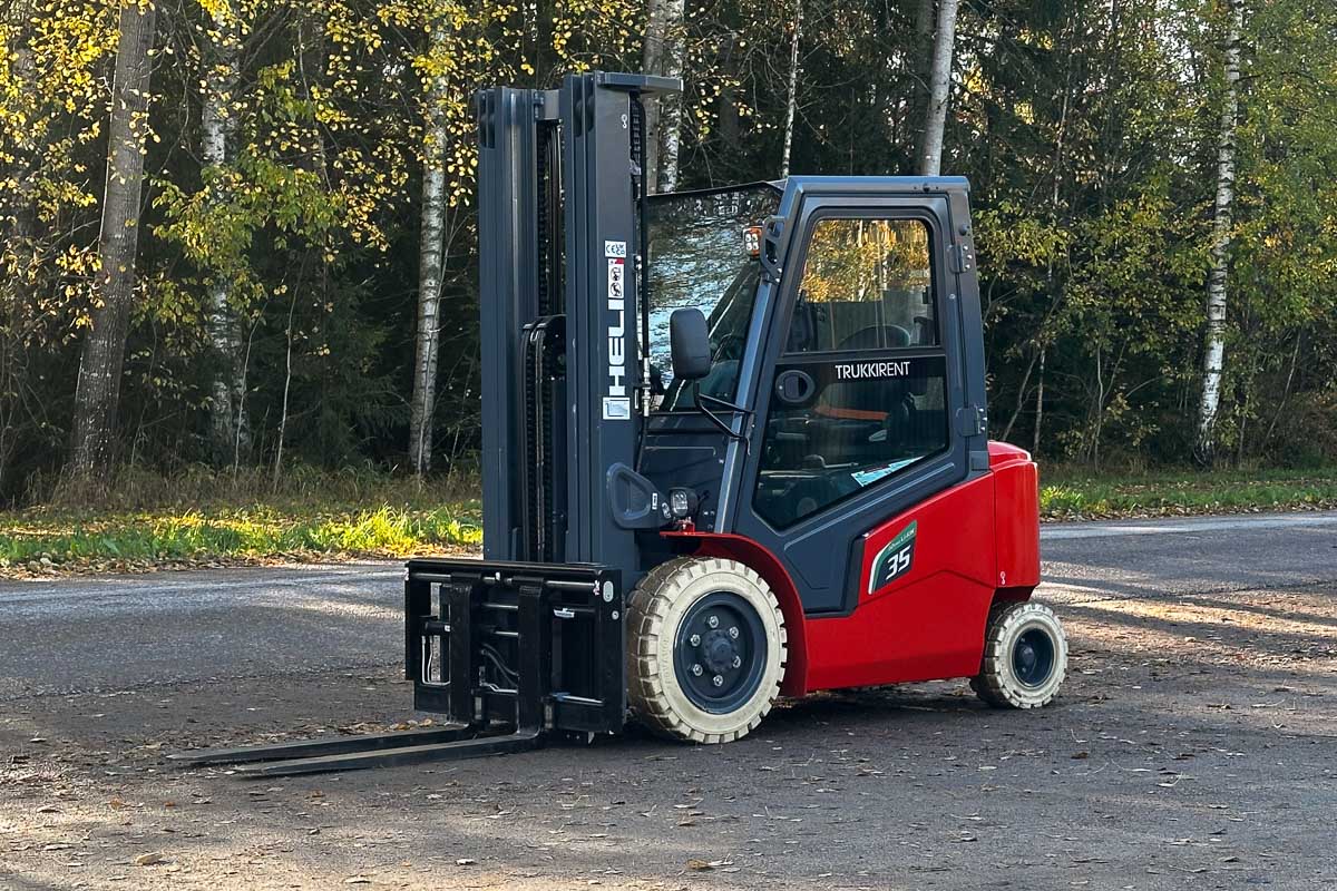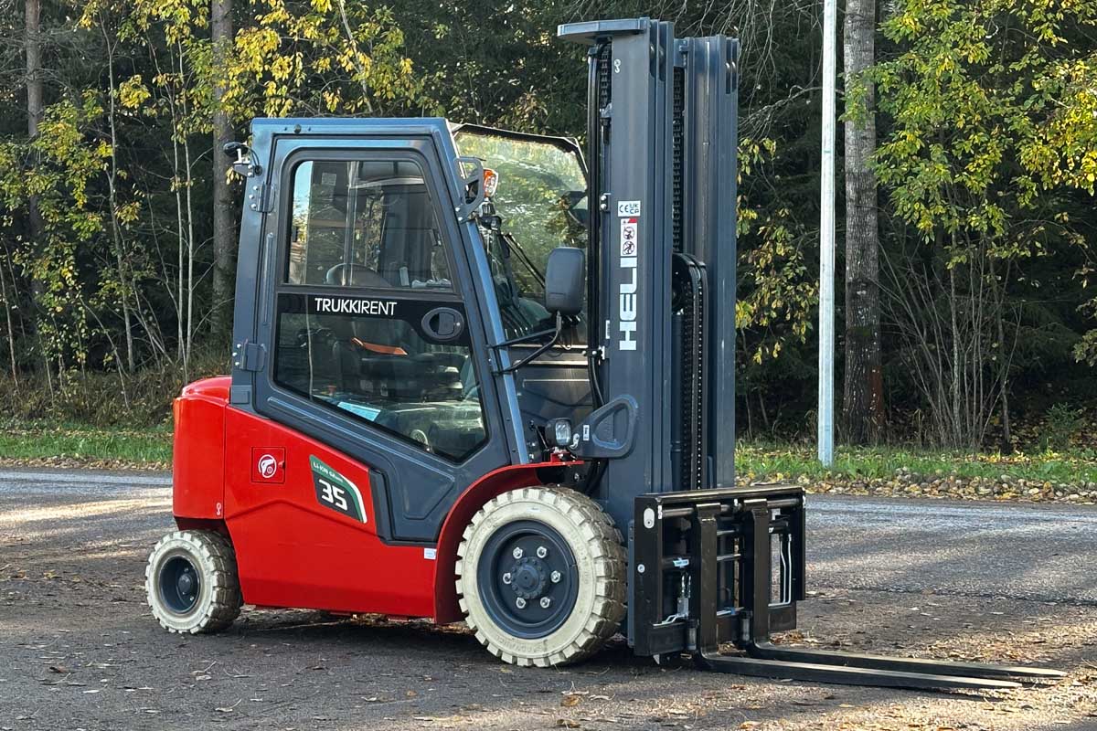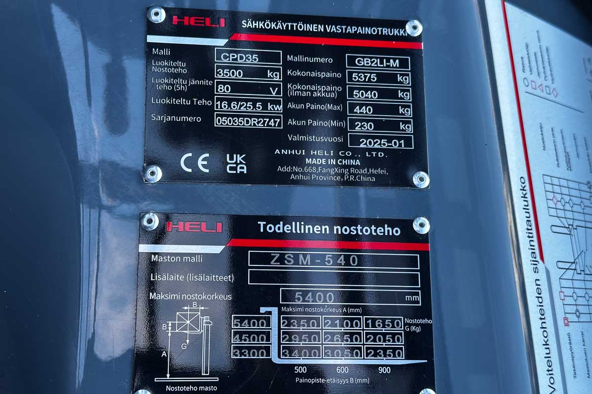 Uusi umpihytillinen sähkövastapainotrukki 3500 kg:n nostokyvyllä. Kolmijatkeinen vapaanostomasto, nostokorkeus 5400 mm. Cascaden valmistama asetinlaite.