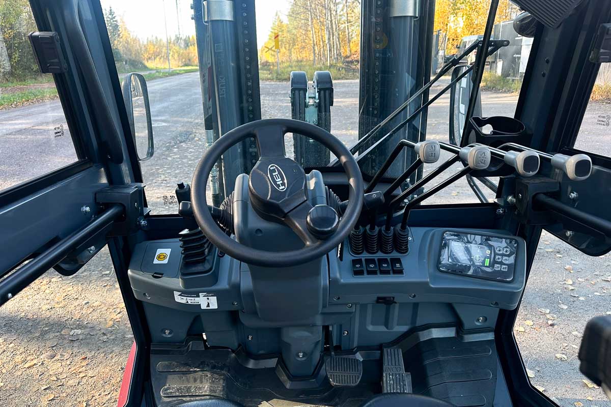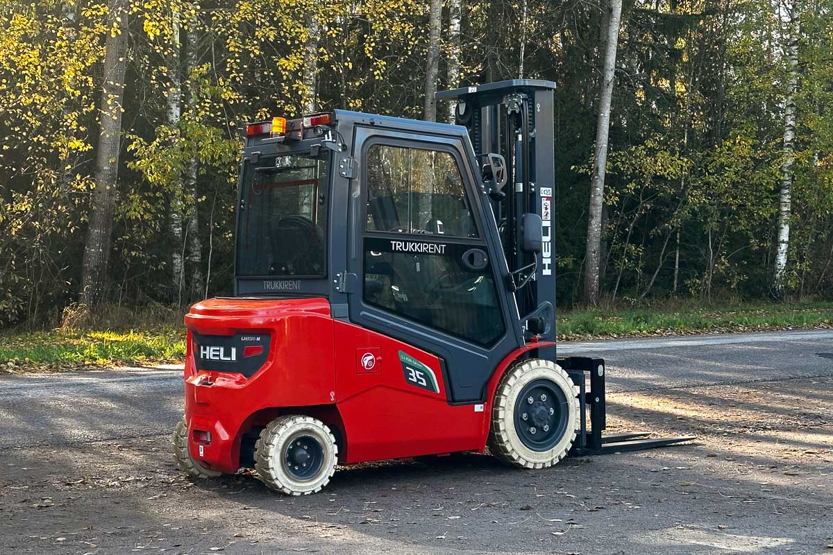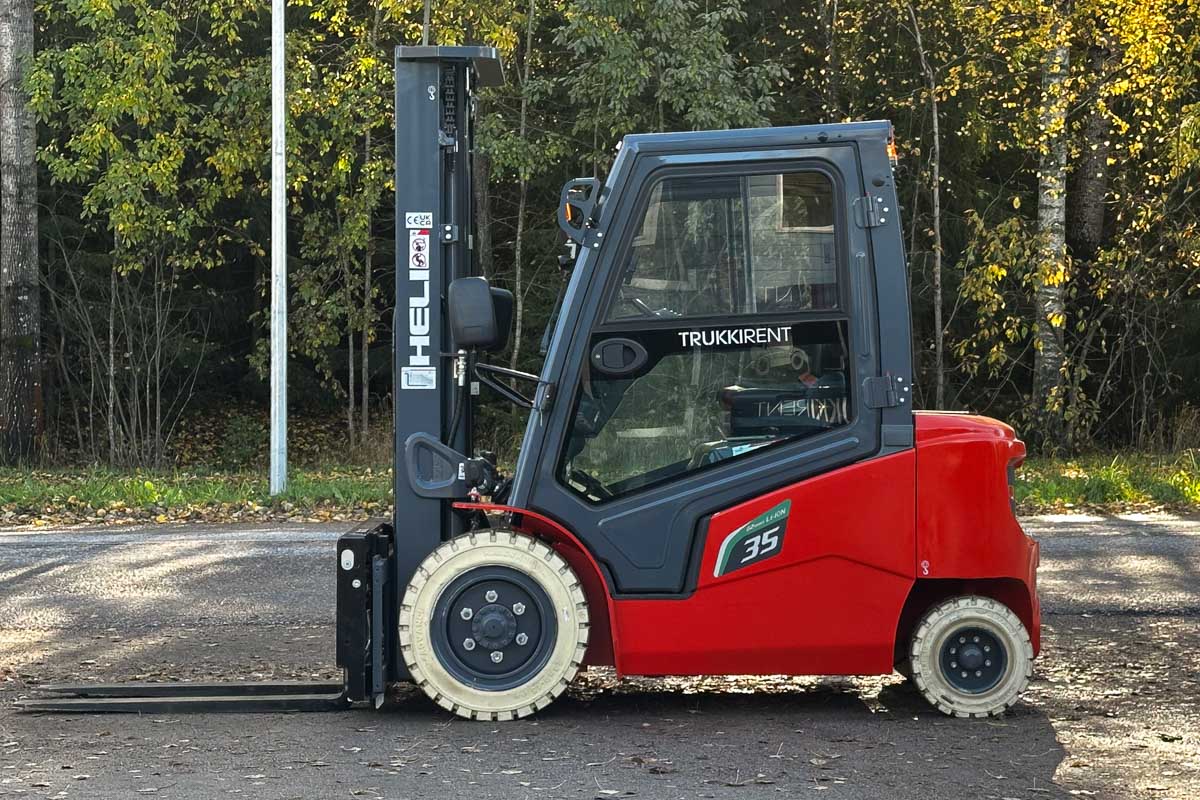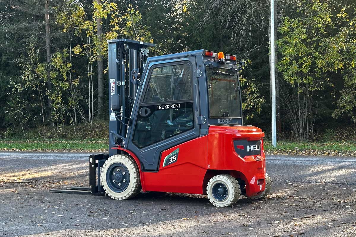 Uusi umpihytillinen sähkövastapainotrukki 3500 kg:n nostokyvyllä. Kolmijatkeinen vapaanostomasto, nostokorkeus 5400 mm. Cascaden valmistama asetinlaite.