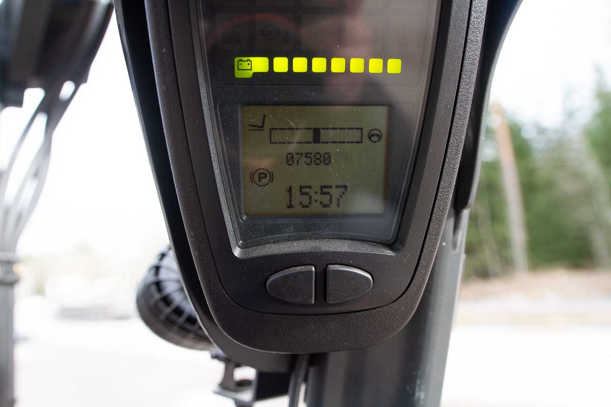 Kolmipyöräinen sähkökäyttöinen vastapainotrukki. Nostokyky 1800 kg, nostokorkeus 4620 mm.