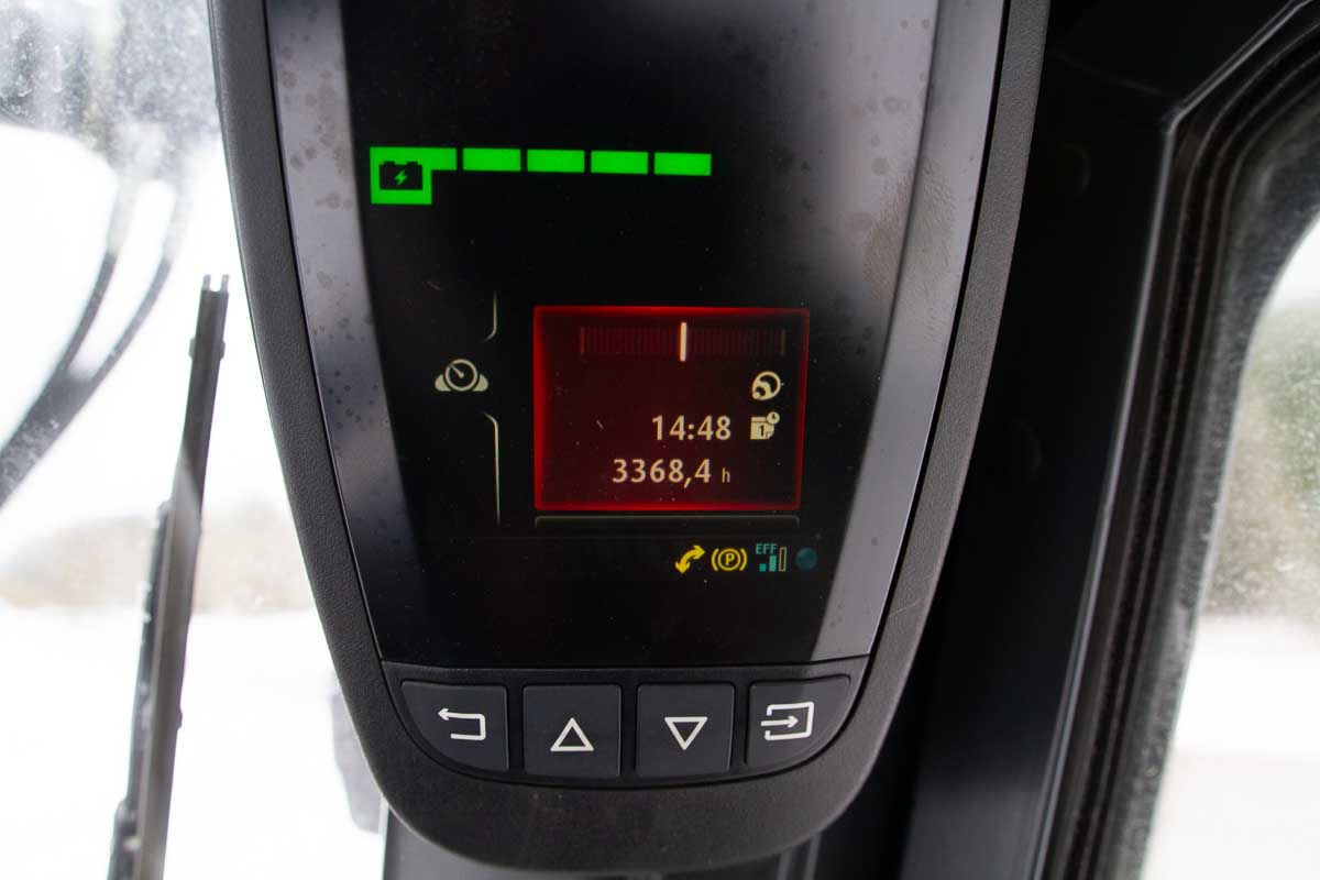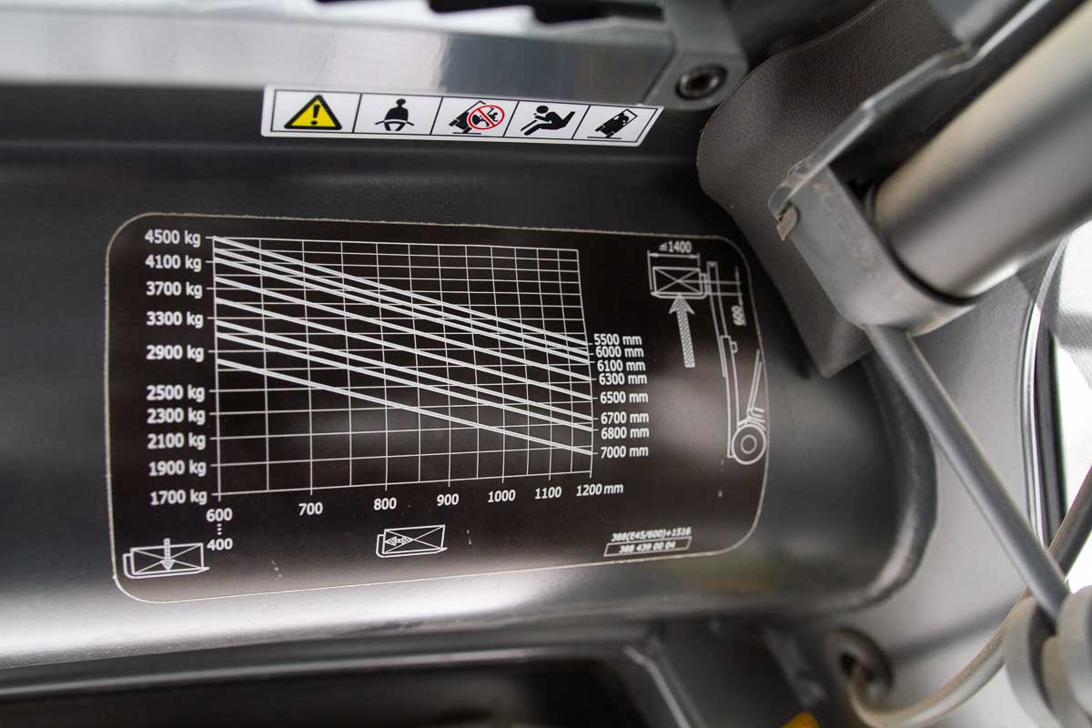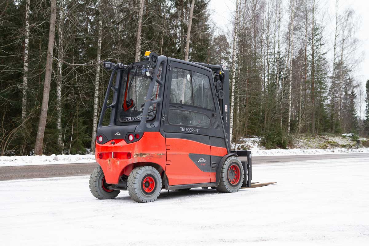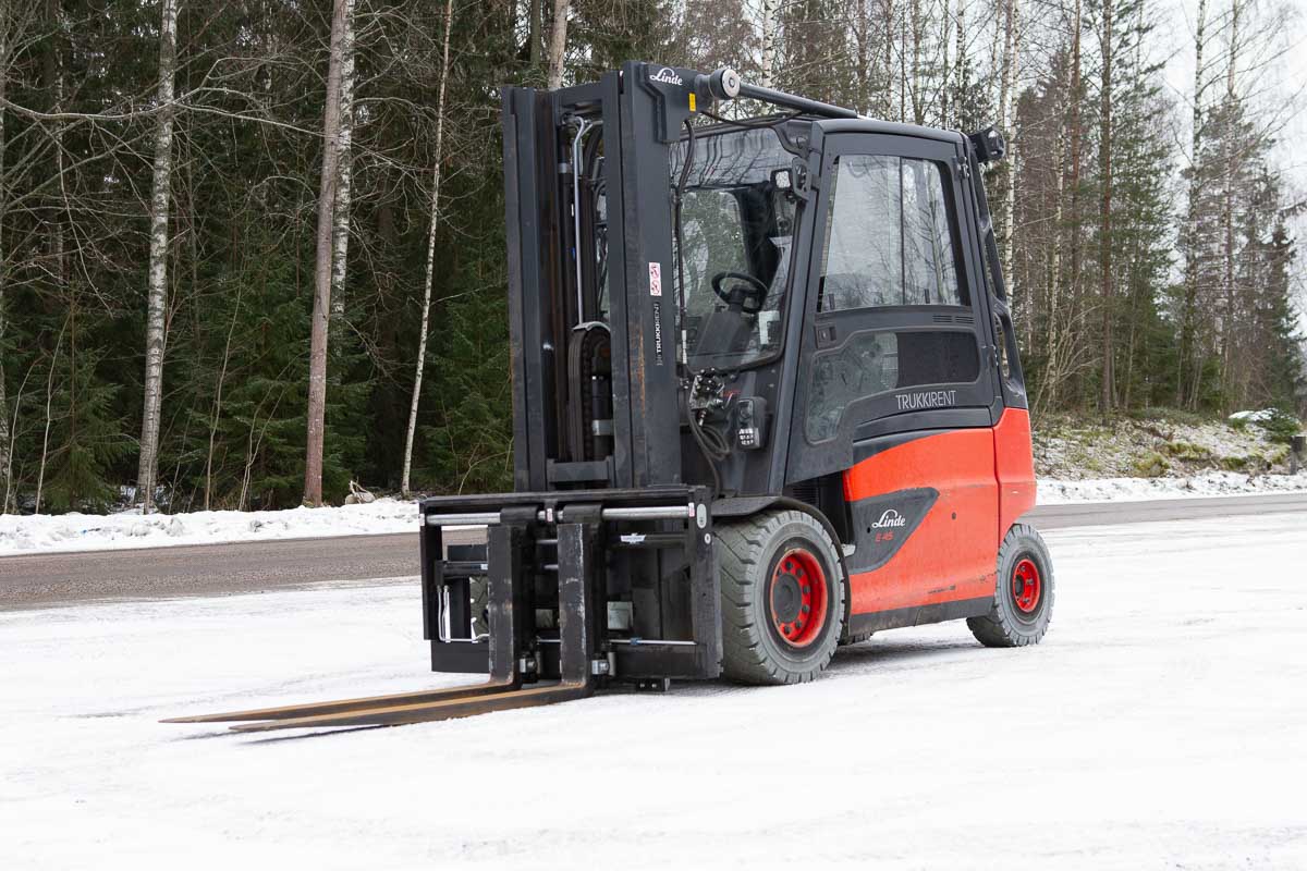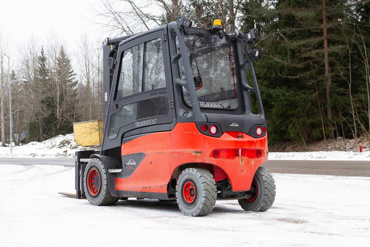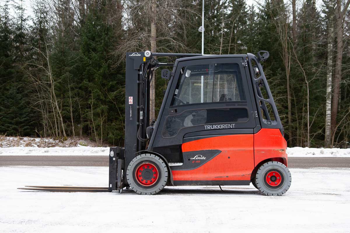 Umpihytillinen sähkövastapainotrukki, nostokyky 4500 kg. Kolmijatkeinen masto vapaanostolla, suurin nostokorkeus 4760 mm. 1600 mm haarukat.