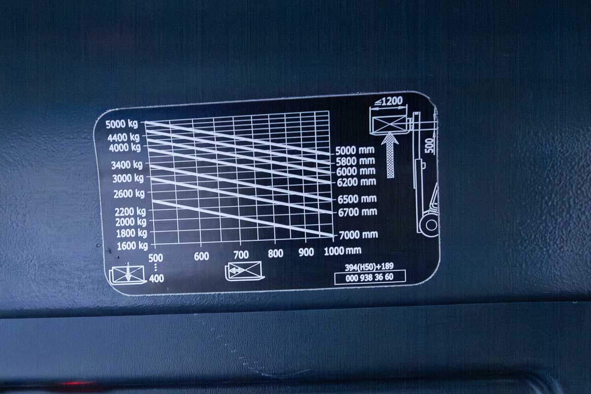 Dieselkäyttöinen vastapainotrukki 5000 kg:n nostokyvyllä. Kolmijatkeinen vapaanostomasto, suurin nostokorkeus 4040 mm. Haarukoiden sivusiirto- ja levityslaite.
