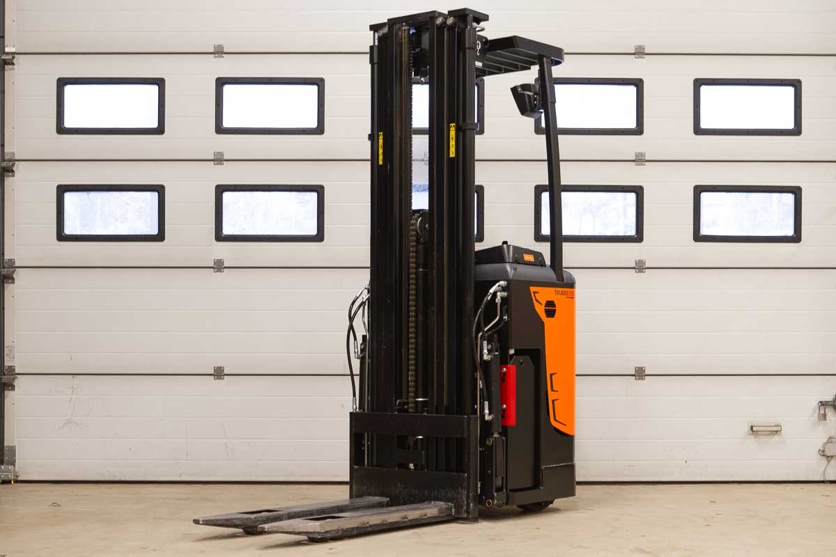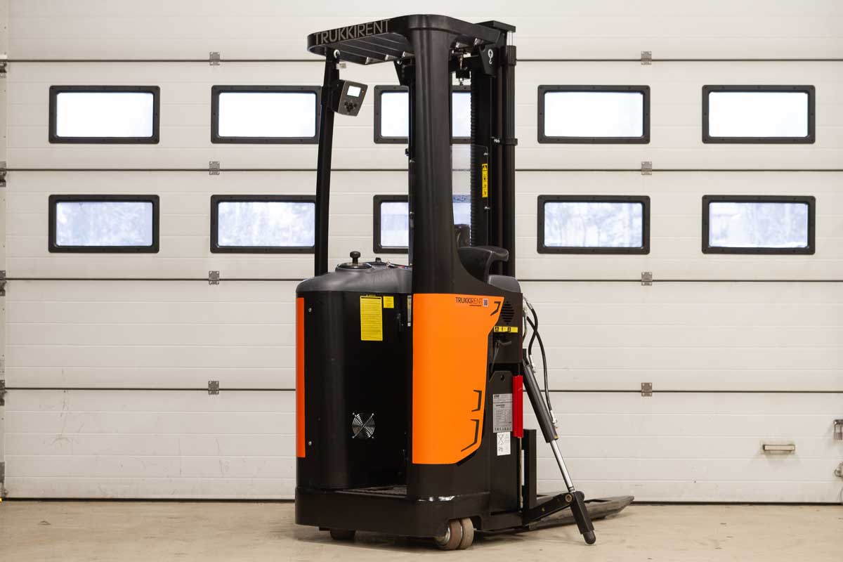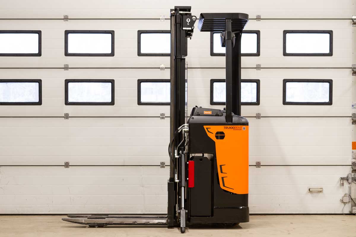 Tukipyörätrukki 5400 mm:n nostokorkeudella. Nostokyky 1200 kg. Rakennekorkeus 2400 mm. Akku 24 V / 375 Ah.