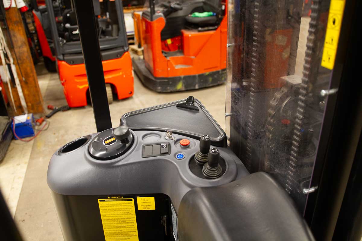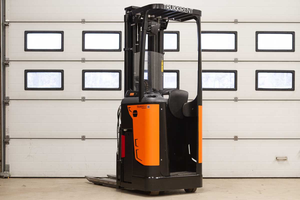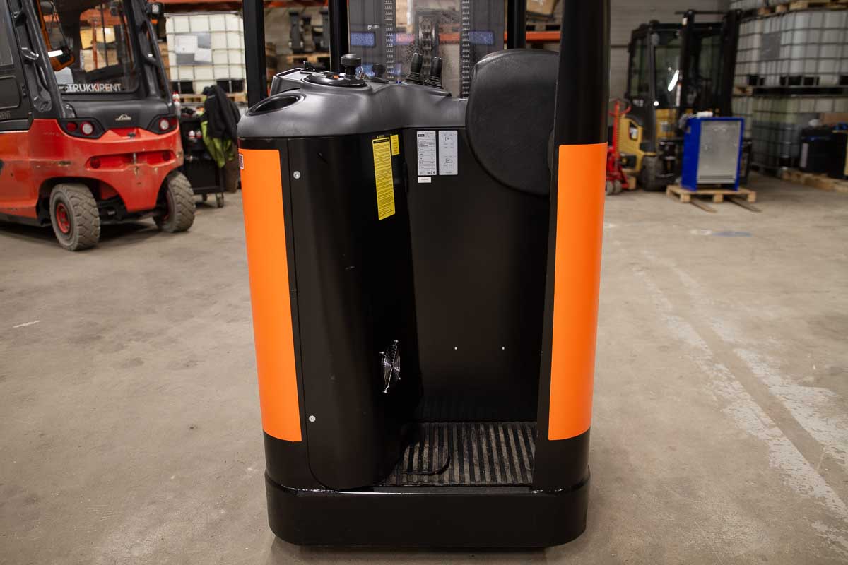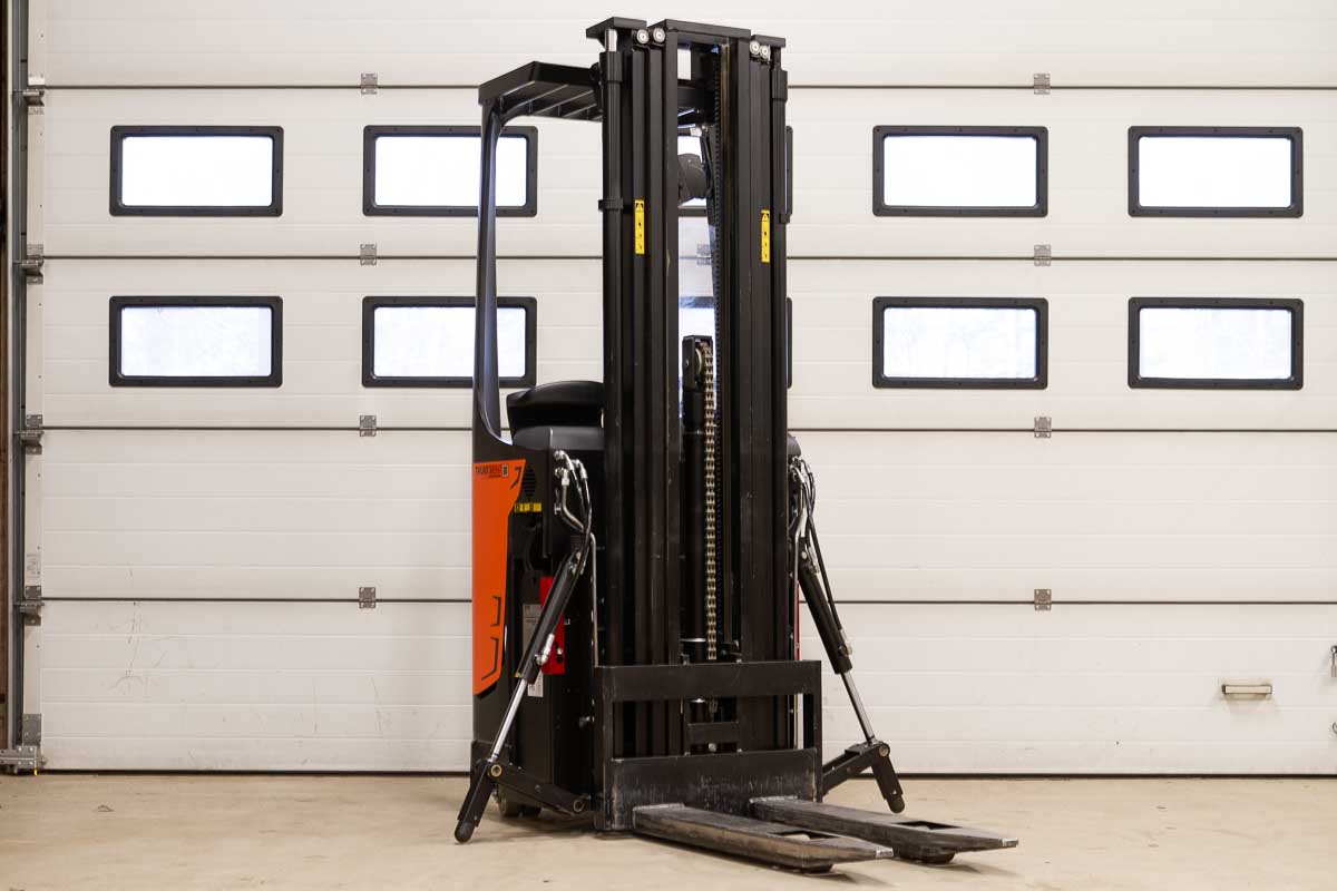 Tukipyörätrukki 5400 mm:n nostokorkeudella. Nostokyky 1200 kg. Rakennekorkeus 2400 mm. Akku 24 V / 375 Ah.