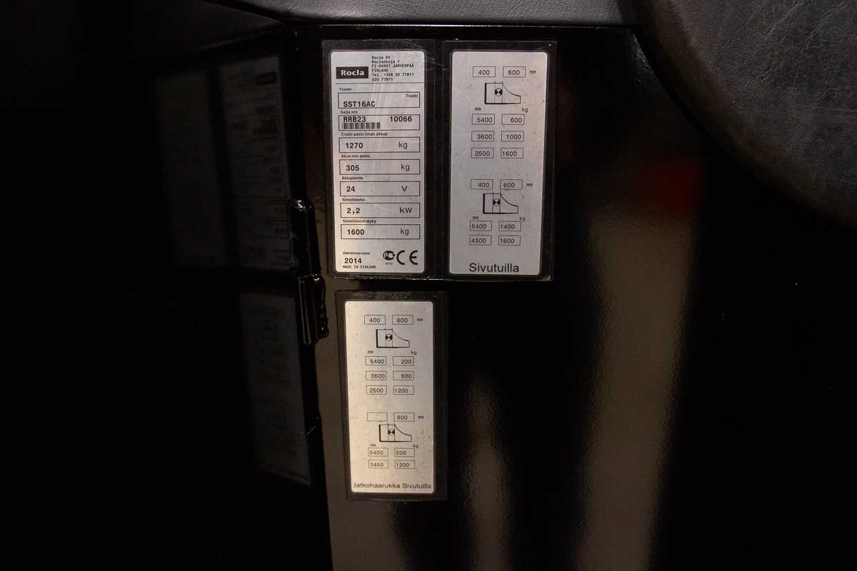 Seisten ajettava, sivutuilla varustettu pinoamisvaunu 1600 kg:n nostokyvyllä. Triplex-masto vapaanostolla, nostokorkeus 5400 mm.
