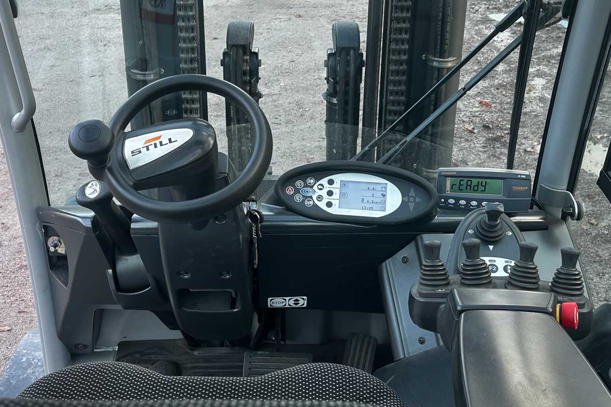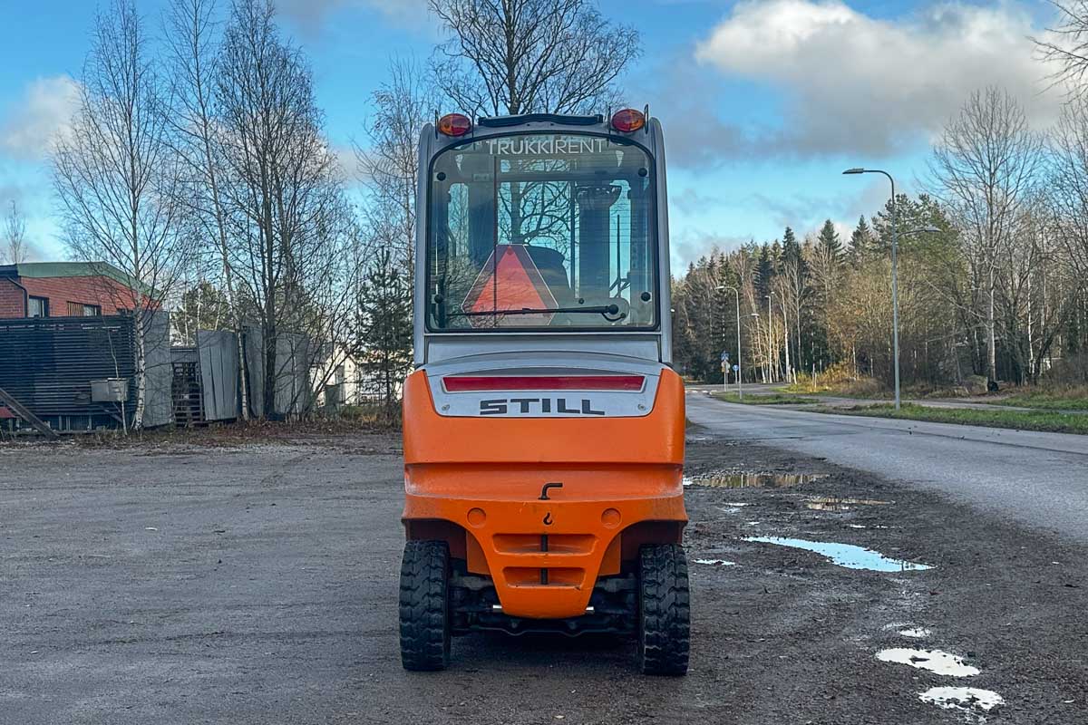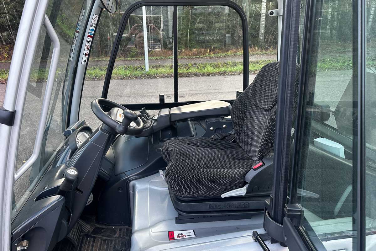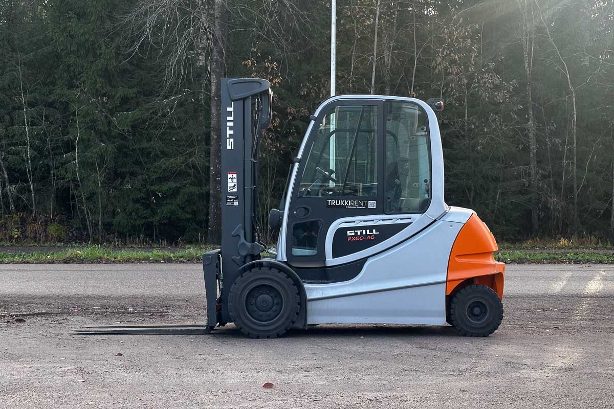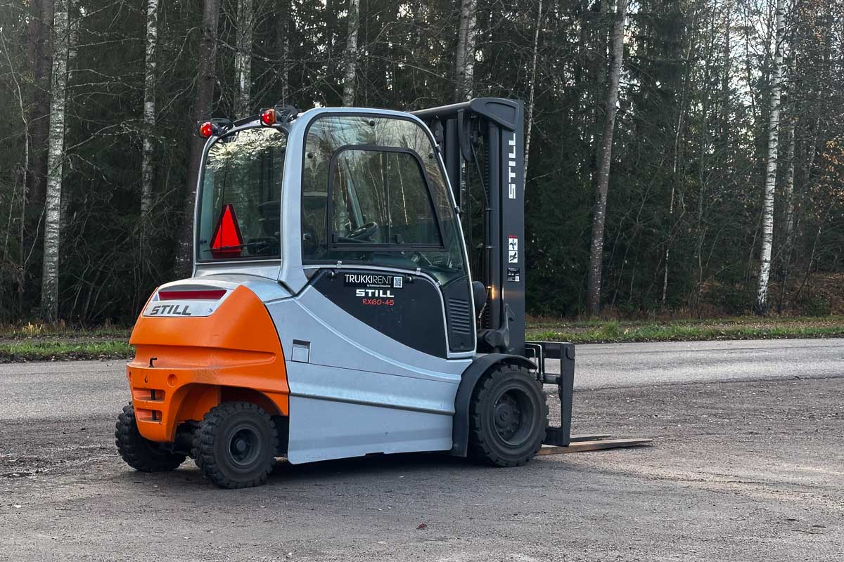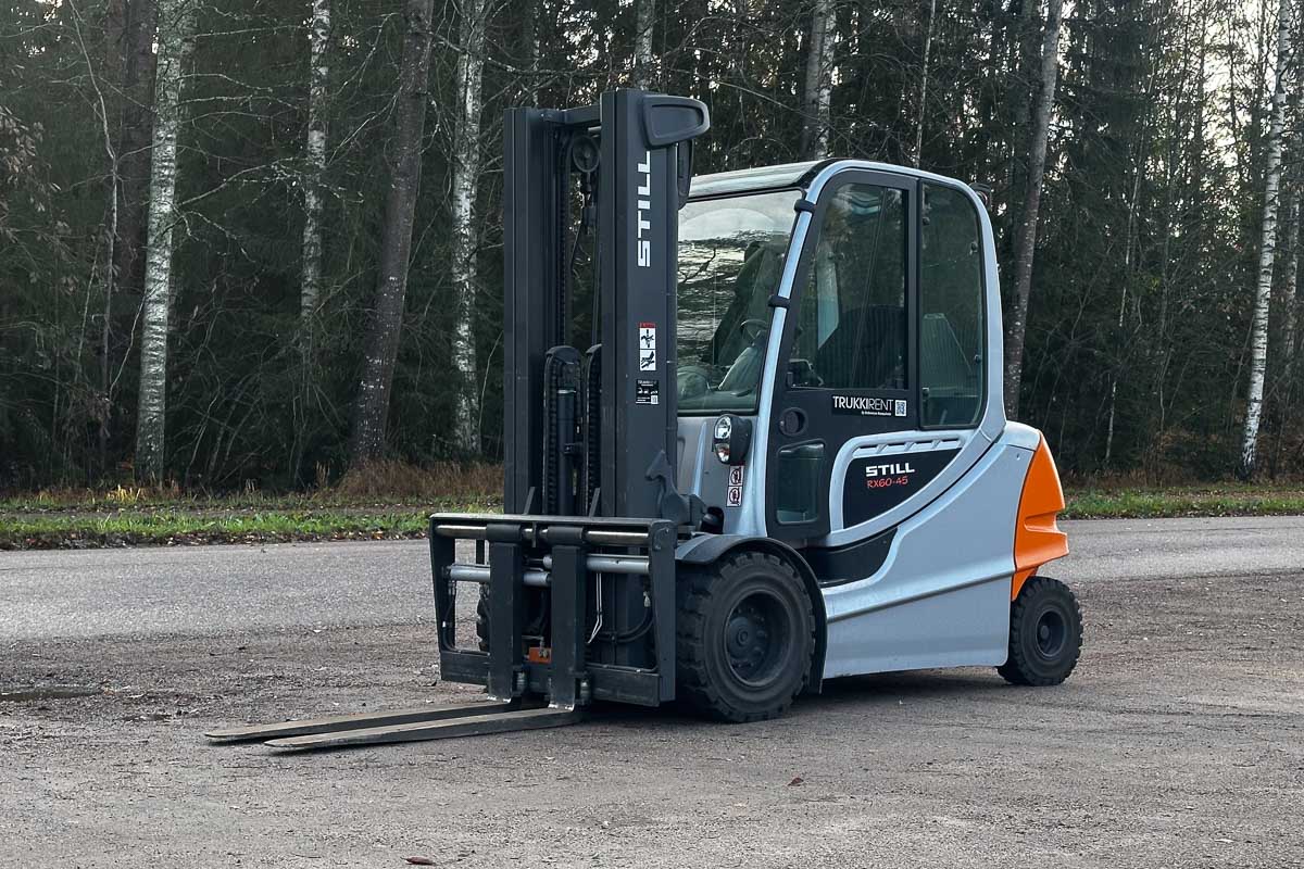 Suorituskykyinen sähkötoiminen vastapainotrukki umpihytillä. Nostokyky 4500 kg. Kolmijatkeinen vapaanostomasto, suurin nostokorkeus 5080 mm.